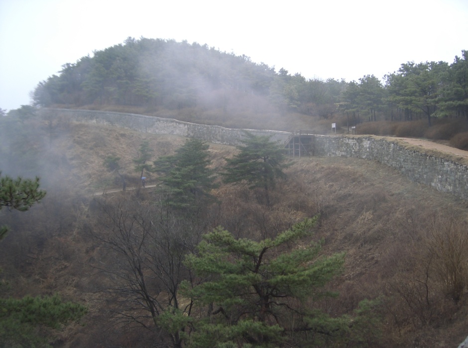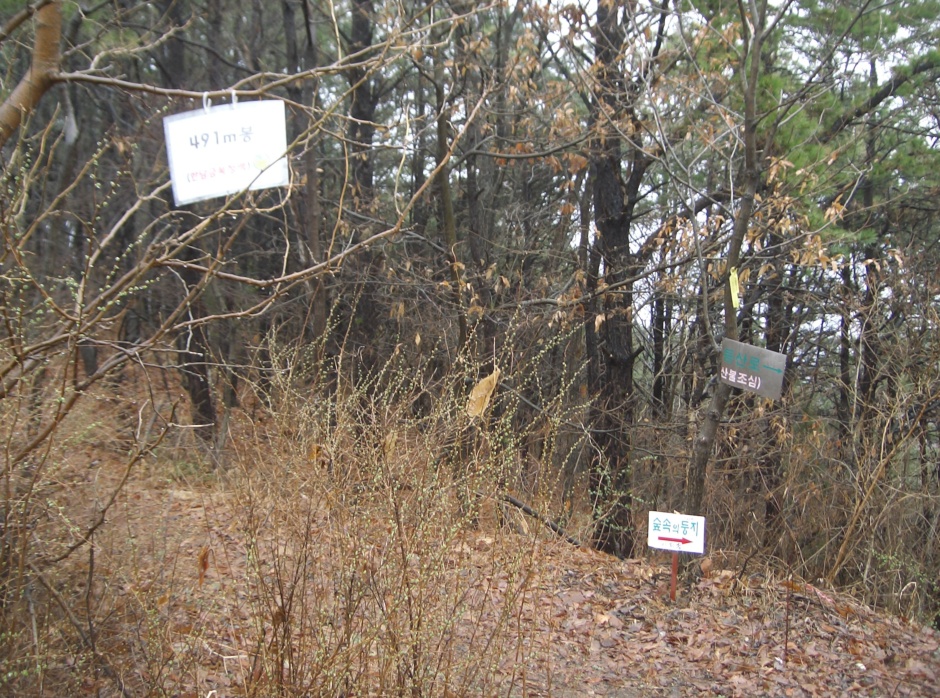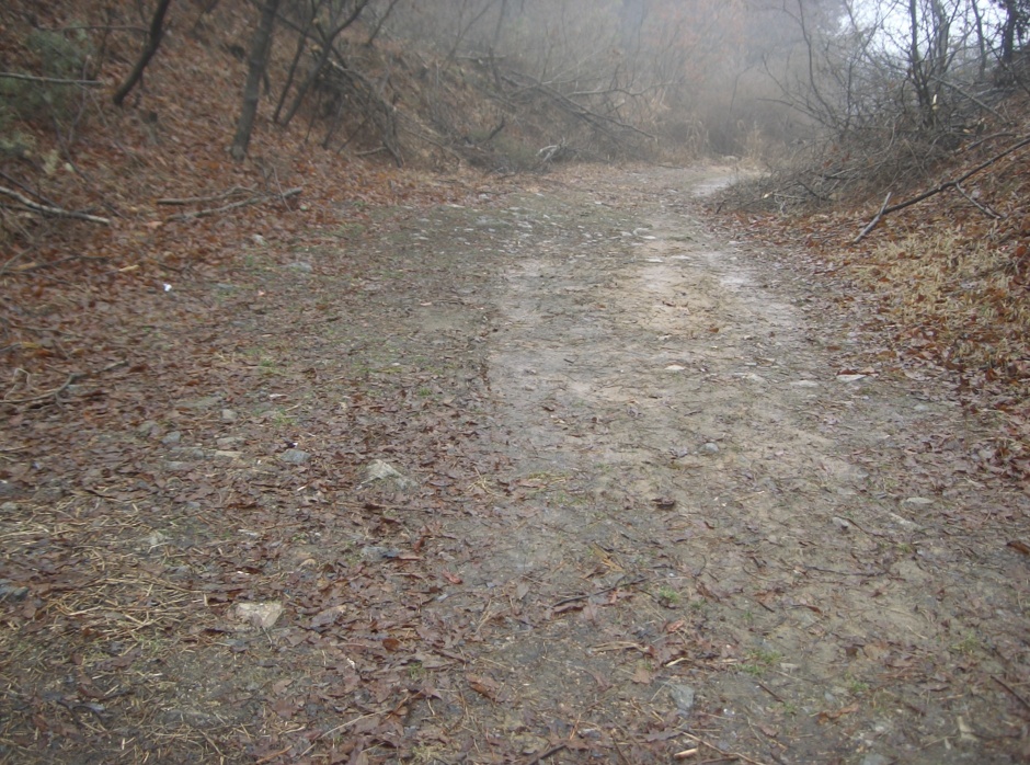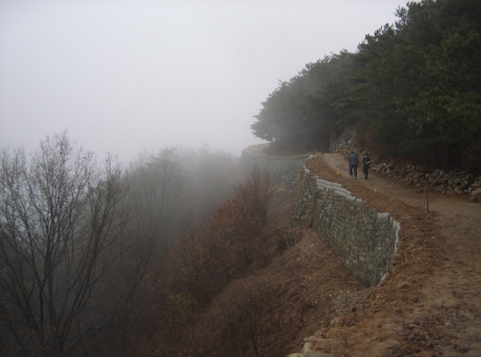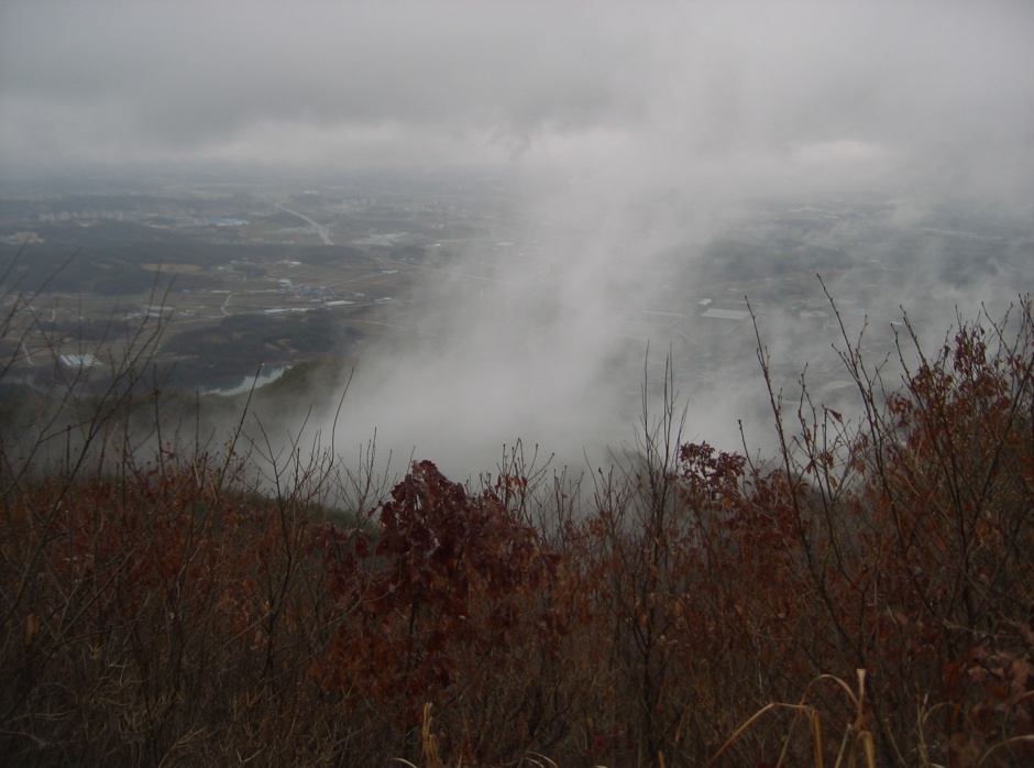 상당산성을 벗어나서 또 한번의 실수가 있었다. 지도상에서 진행 방향이 북동쪽인데, 나침반으로 방향을 찿아 계속 가던 도중 능선이 이상한 방향으로 흐르고 있다는 것을 간파했다. 내가 따라 가던 능선은 북동쪽으로 조금 가다가 동쪽으로 방향을 틀더니 남쪽으로 흘렀다. 엉뚱한 길로 들어섰던 것이다. 구름에 가린 탓으로 시야가 확보되지 않았고, 목표물을 정확히 가늠할 수가 없었다. 뒤로 돌아가기엔 너무 멀리 떠나 왔다는 생각에 하는 수 없이 마을로 내려서서 다시 위치 점검을 하기로 했다.