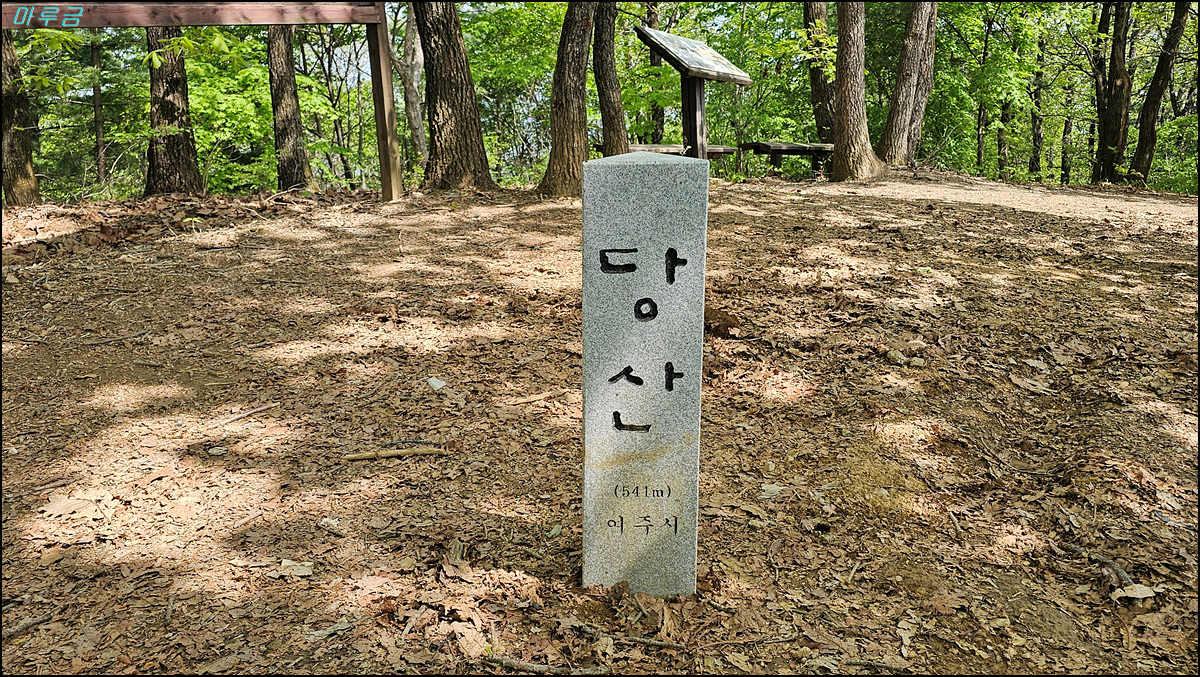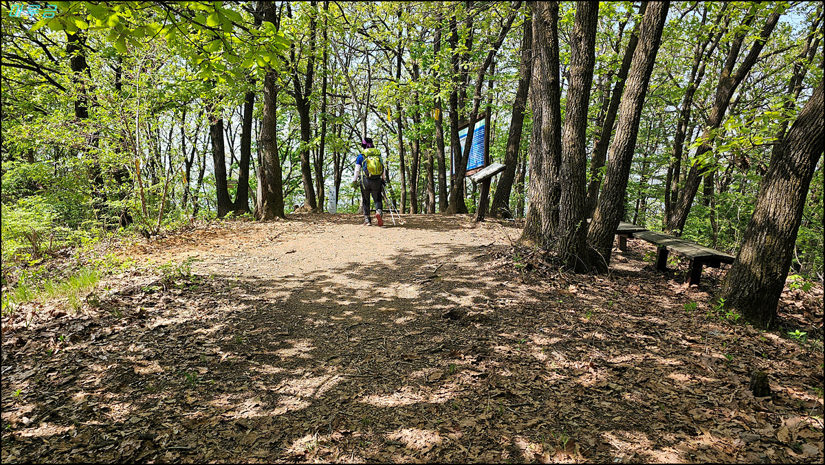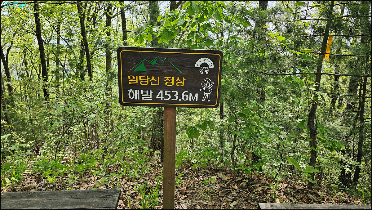 경기도 양평군 양동면과 여주시 강천면 경계에 있는 산이다. 정상석은 없다. 이정표 꼭대기의 표지판이 정상 표시다. 사방이 숲에 가려서 조망은 완전히 꽝이다. 예전에 있었던 긴 의자는 없어졌다. 그리 넓지 않은 공터지만 쉬기에는 불편함이 없는 곳이다.