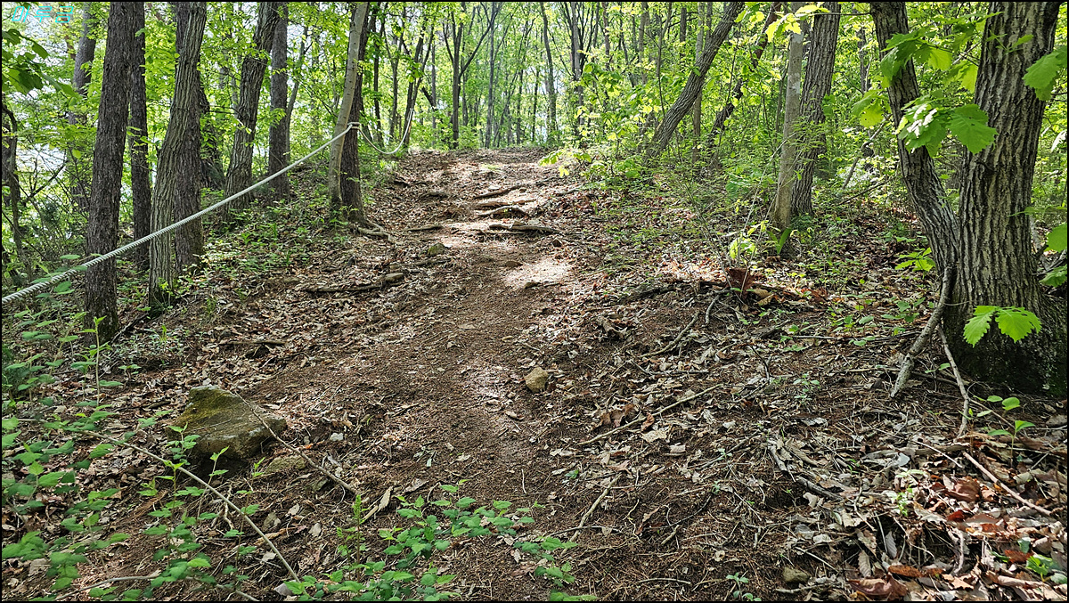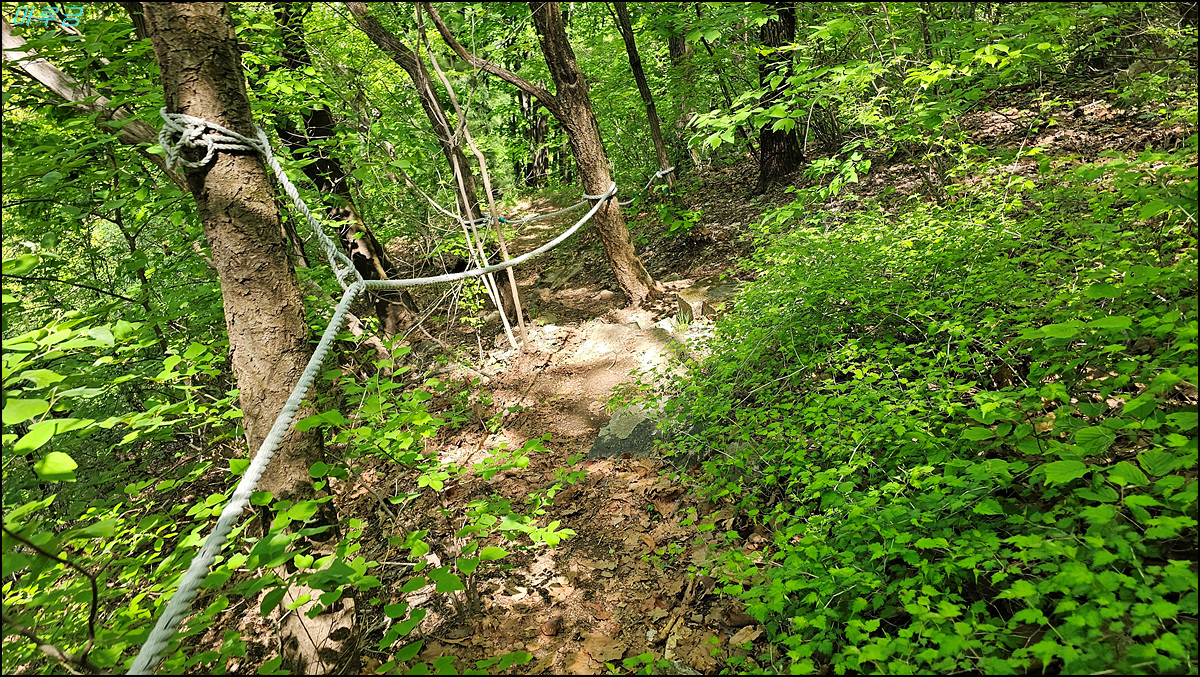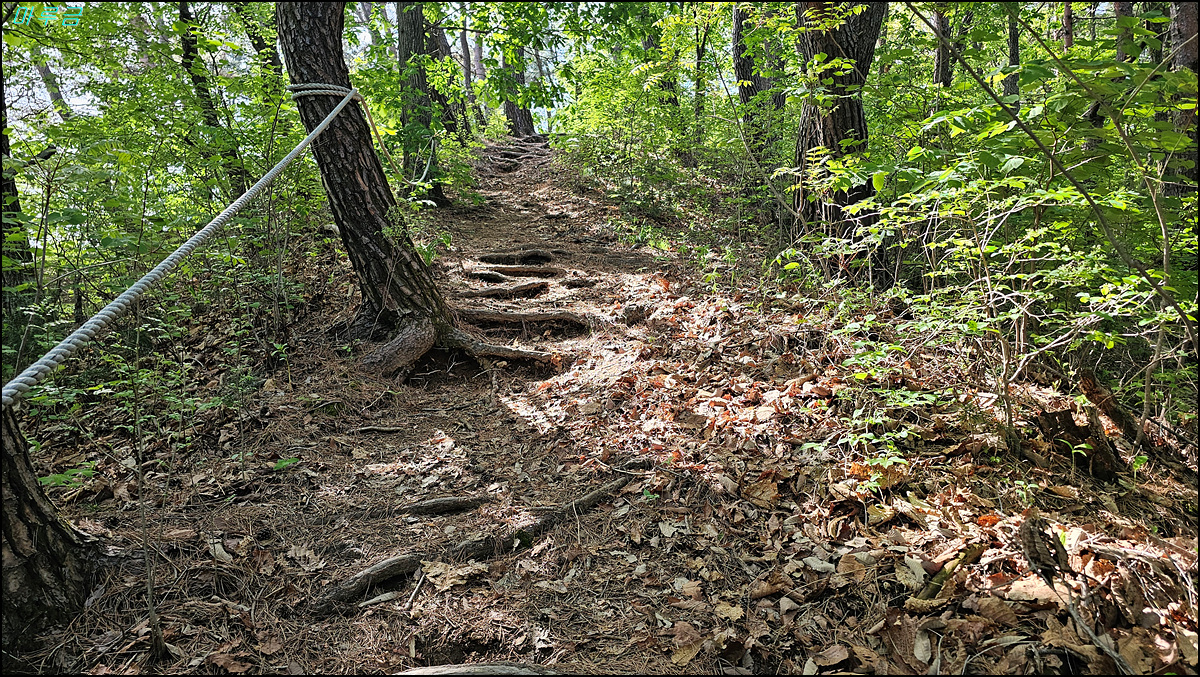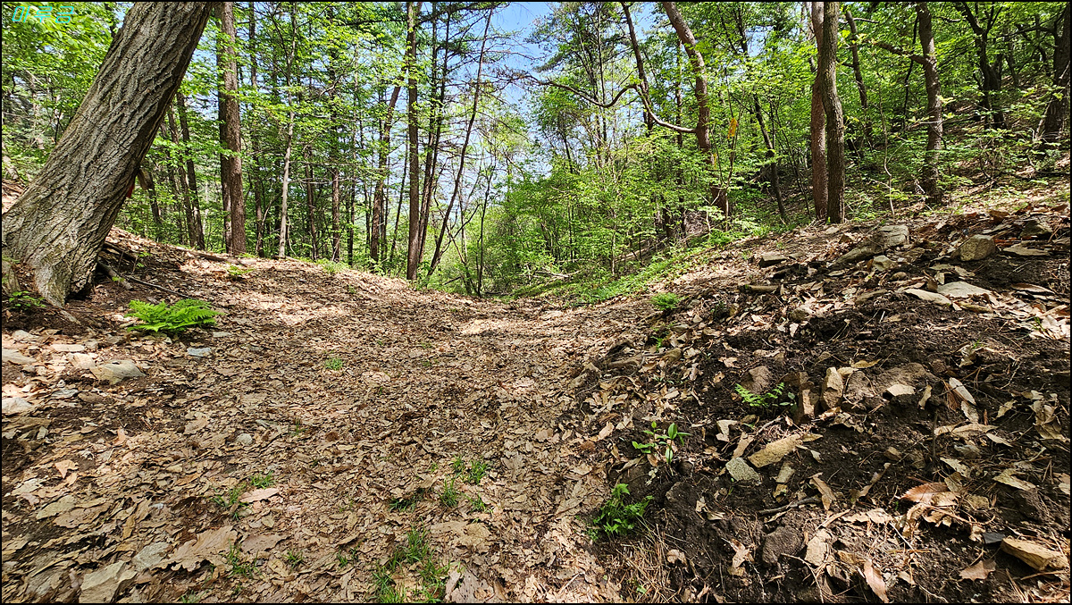 '등산로 아님'과 '등산로' 표지판이 붙은 440 고지 분기점에서 우측의 '등산로' 표지판 방향으로 내려섰다.