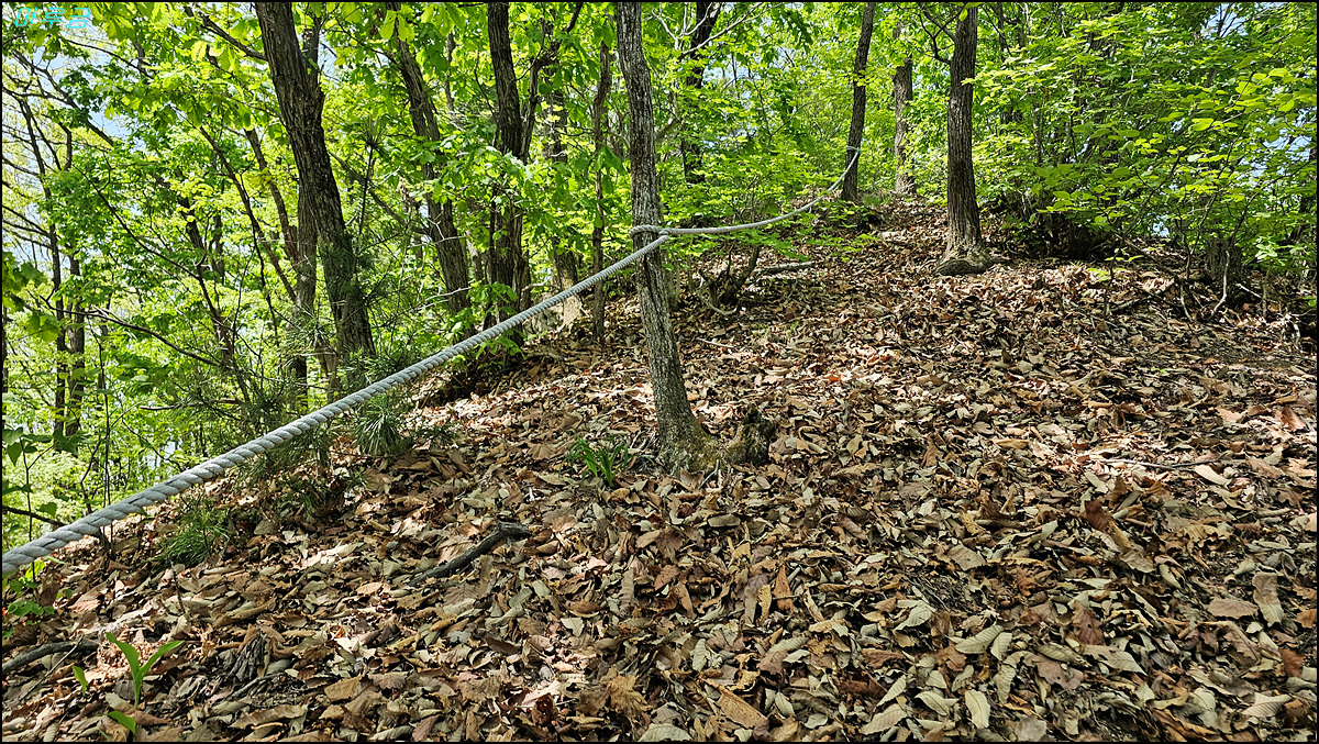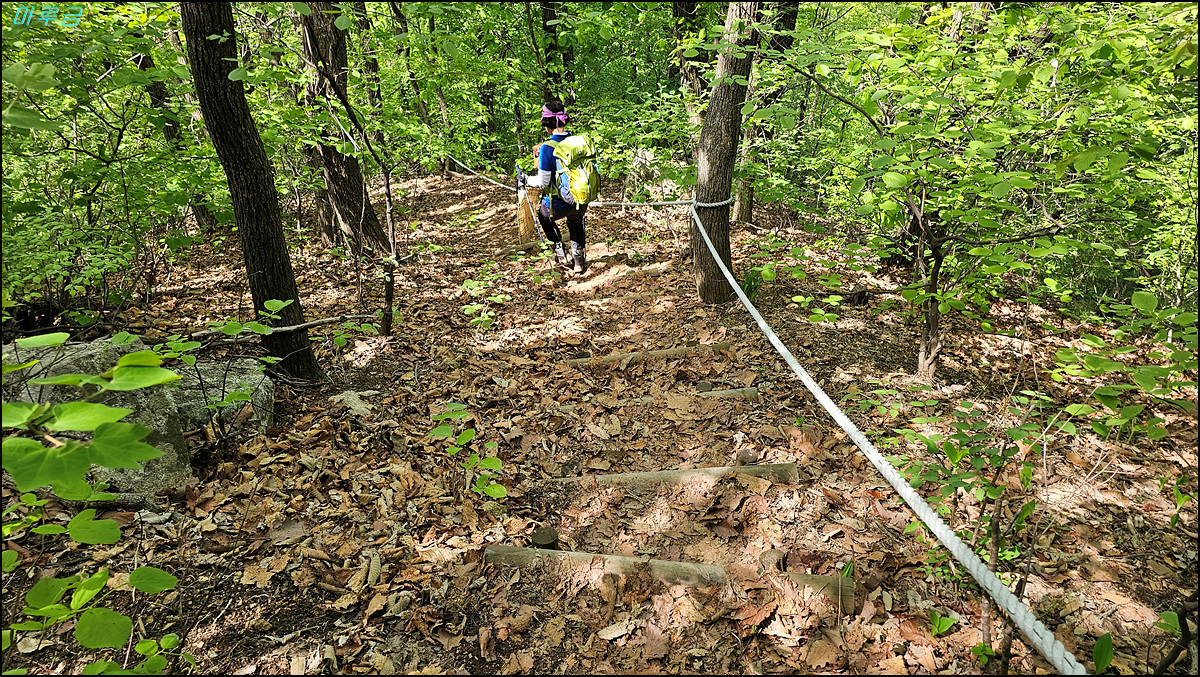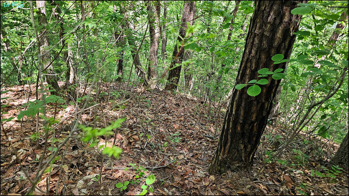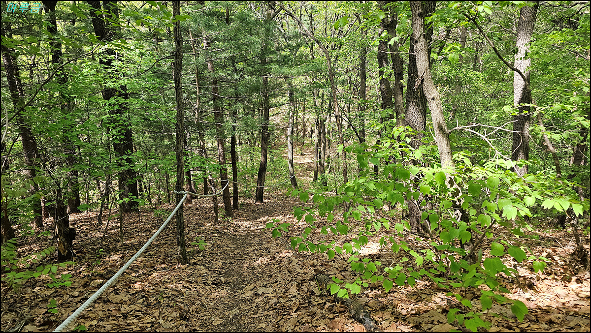 '등산로 아님'과 '등산로' 표지판이 붙은 440 고지 분기점에서 우측의 '등산로' 표지판 방향으로 내려섰다.