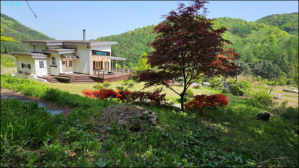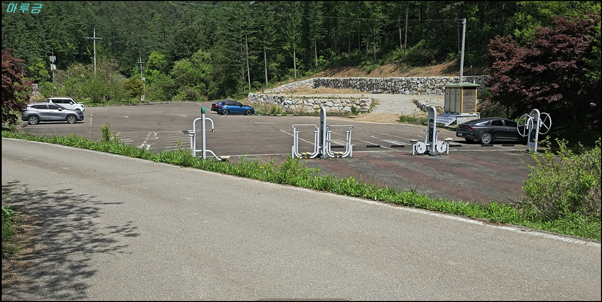 작은 개울을 건너고, 청색 물통을 지나서 내려가면 민가 마당을 가로질러 지나가게 됨