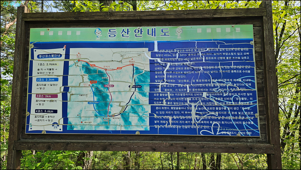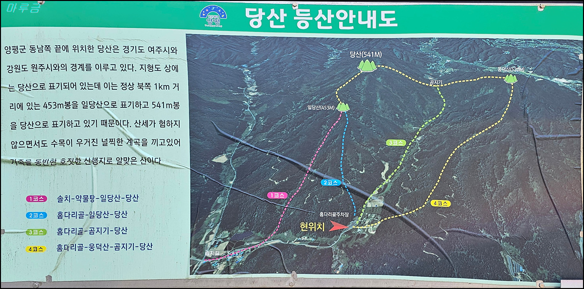 경기도 양평군과 여주시, 강원도 원주시에 걸친 일당산, 당산, 웅덕산, 갈번데기산을 연계해서 다녀왔다. 교통편은 자차를 이용했으며, 양평 쪽의 홈다리골 주차장에서 산행을 시작하여 시계방향으로 돌아서 원점산행으로 마쳤다. 이곳은 예전에 다녀온 바 있는 산행지다.