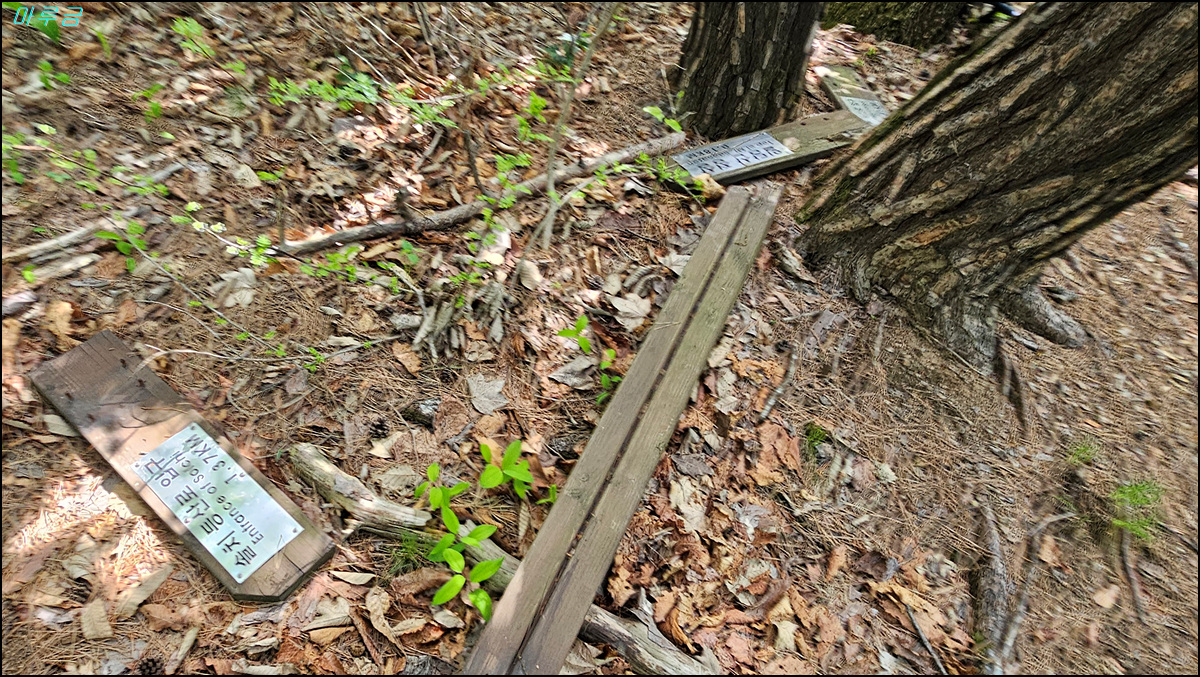 망가진 솔치갈림길 이정표 (참고 : 표지판이 방향에 맞게 놓여있으므로 위치 변경 하지 마세요)