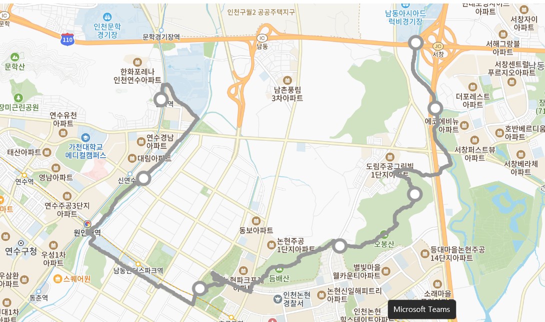 코스 : 남동체육관~장수천~오봉산~생태통로(소낭데이고개)~듬배산~논현포대근린공원~산단본부사거리~승기천~선학역 3번 출구