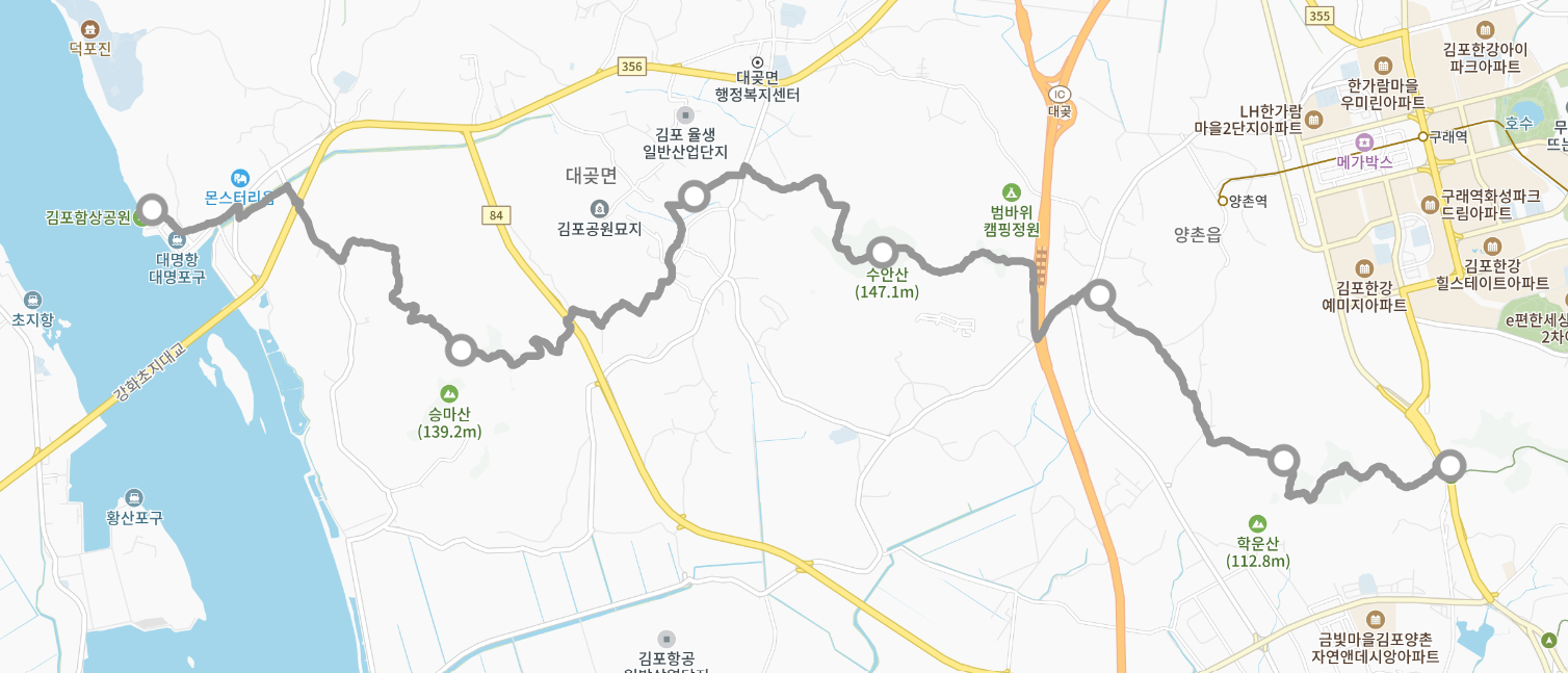 코스 : 스무네미고개~학운산~경기둘레길 60코스 시점~대호정~수안산~상마리 표석~승마산~구 OP에서 유턴~약암관광호텔~대명항 함상공원
